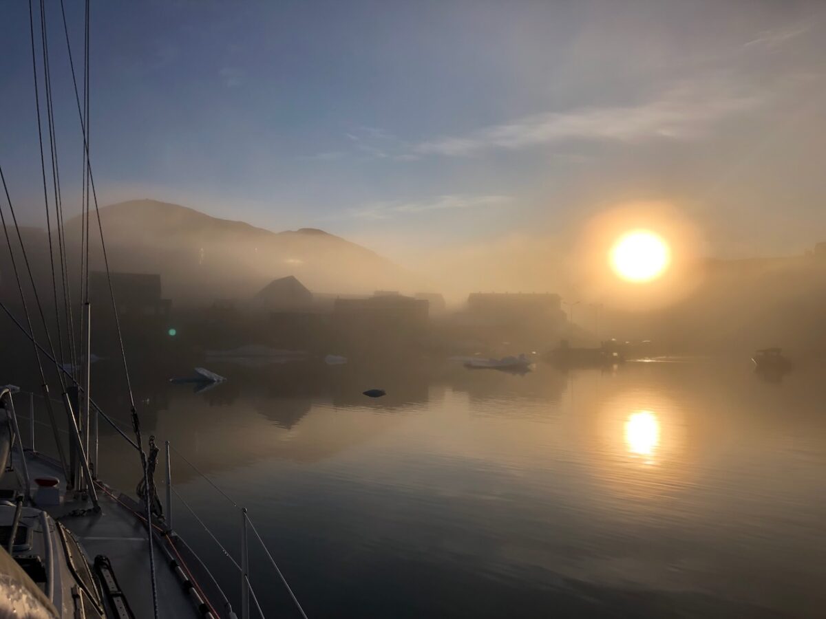 Auch an diesem Ankerplatz beschäftigt uns treibendes Eis. Weiter nördlich ist noch alles zugefroren, der Fjord westlich ist ebenfalls noch eisbedeckt. Die Captain entscheidet um 02:00 Uhr wieder nach Süden Richtung Scoresbysund zu laufen. In der Hoffnung vor dem nächsten Windfeld, was die Eisbedingungen wieder ändern kann, in den Scoresbysund zurückzukommen. Klappt leider nicht. Wir laufen mit bis zu 25 kn Wind im dichten Nebel nach Süden. Der Nebel gefriert und das Rigg wird von einem Eisfilm bedeckt. Da sich die Bedingungen an Kap Hodgson nicht bessern laufen wir am frühen Morgen in die Buchten hinter Raffles Ø ein. Wind und Nebel bleiben draußen, unsere Ziel, ein Ankerplatz im Lillefjord (Kangertivatsiákajik) ist mit frischen Eis bedeckt. Es ist zum Glück so ruhig, dass wir uns einfach ein paar Stunden treiben lassen. Die Landschaft ist atemberaubend, die Sonne angenehm warm. Das Eis aus dem Rigg taut schnell und prasselt an Deck. Der Windmesser funktioniert irgendwann auch wieder.