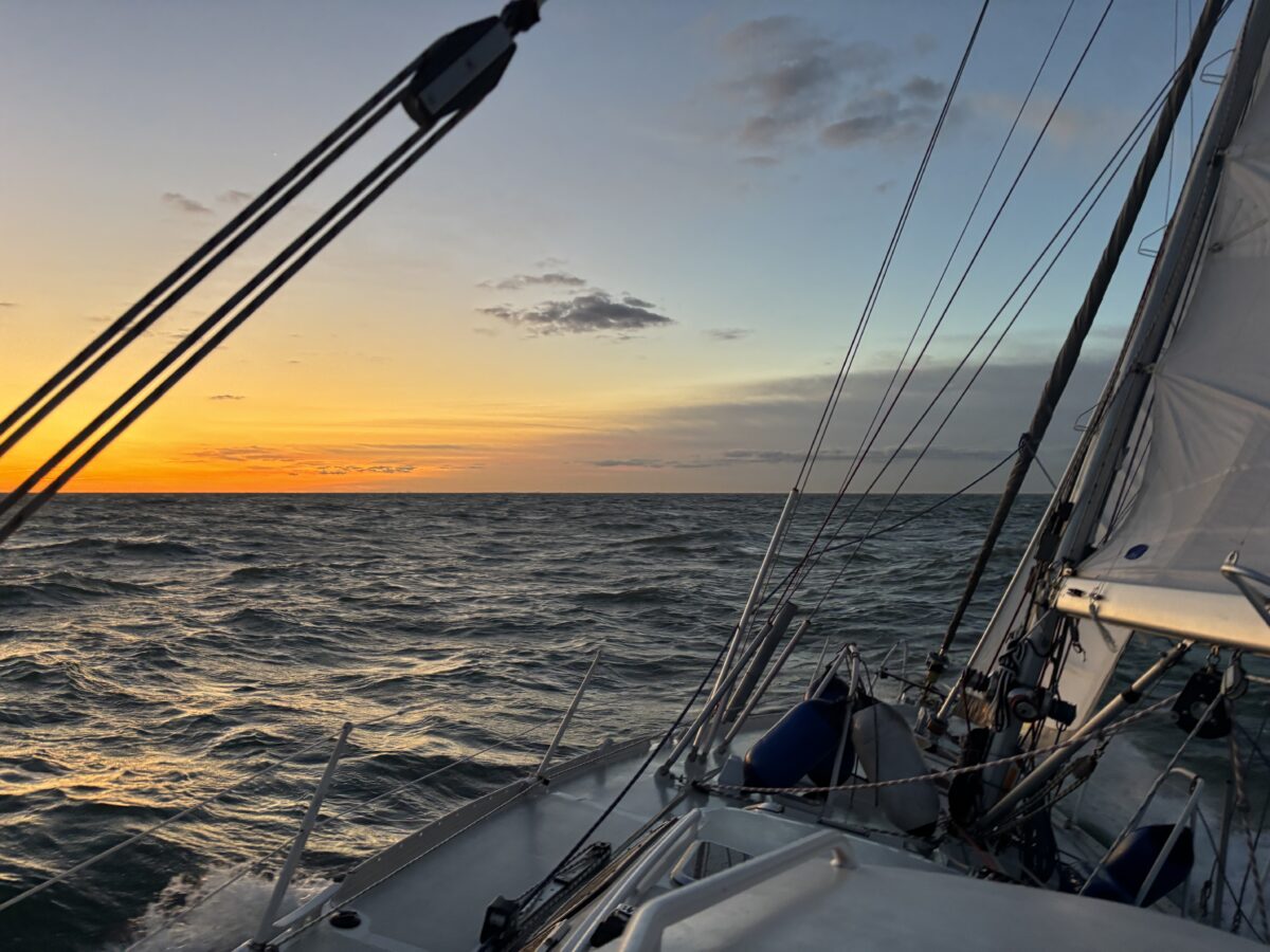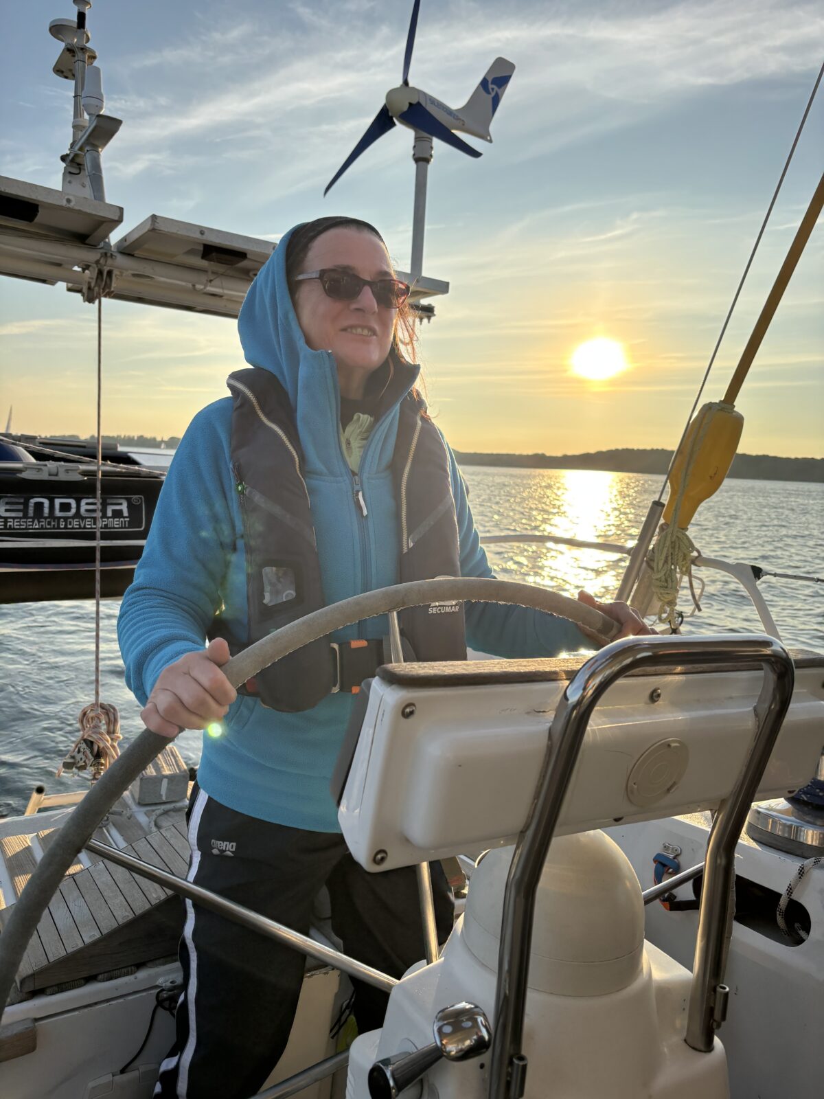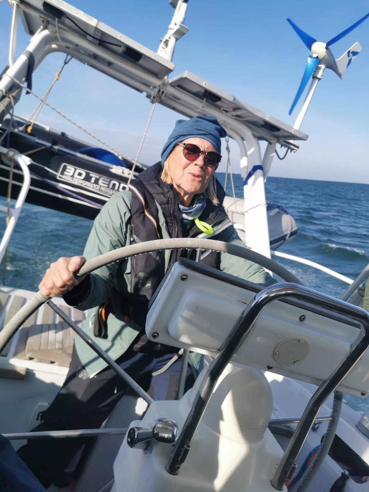 Am letzten Tag (Freitag) haben wir alle zusammen ein köstliches Frühstück an Bord. Tom bringt leckere Brötchen mit. Wie gut, dass die Captain auf die Zeit achtet und wir pünktlich um 11 Uhr ablegen. Bei bestem Segelwetter mit Südostwind und strahlendem Sonnenschein wechseln wir uns bei 8-9 Knoten mit steuern ab. (heute mal kein Autopilot!). Uta und Gerda singen für den Steuermann Holger abwechselnd Lieblingssongs aus vergangener Zeit. Man bedenke unser Alter. Die Captain flüchtet in den Salon.