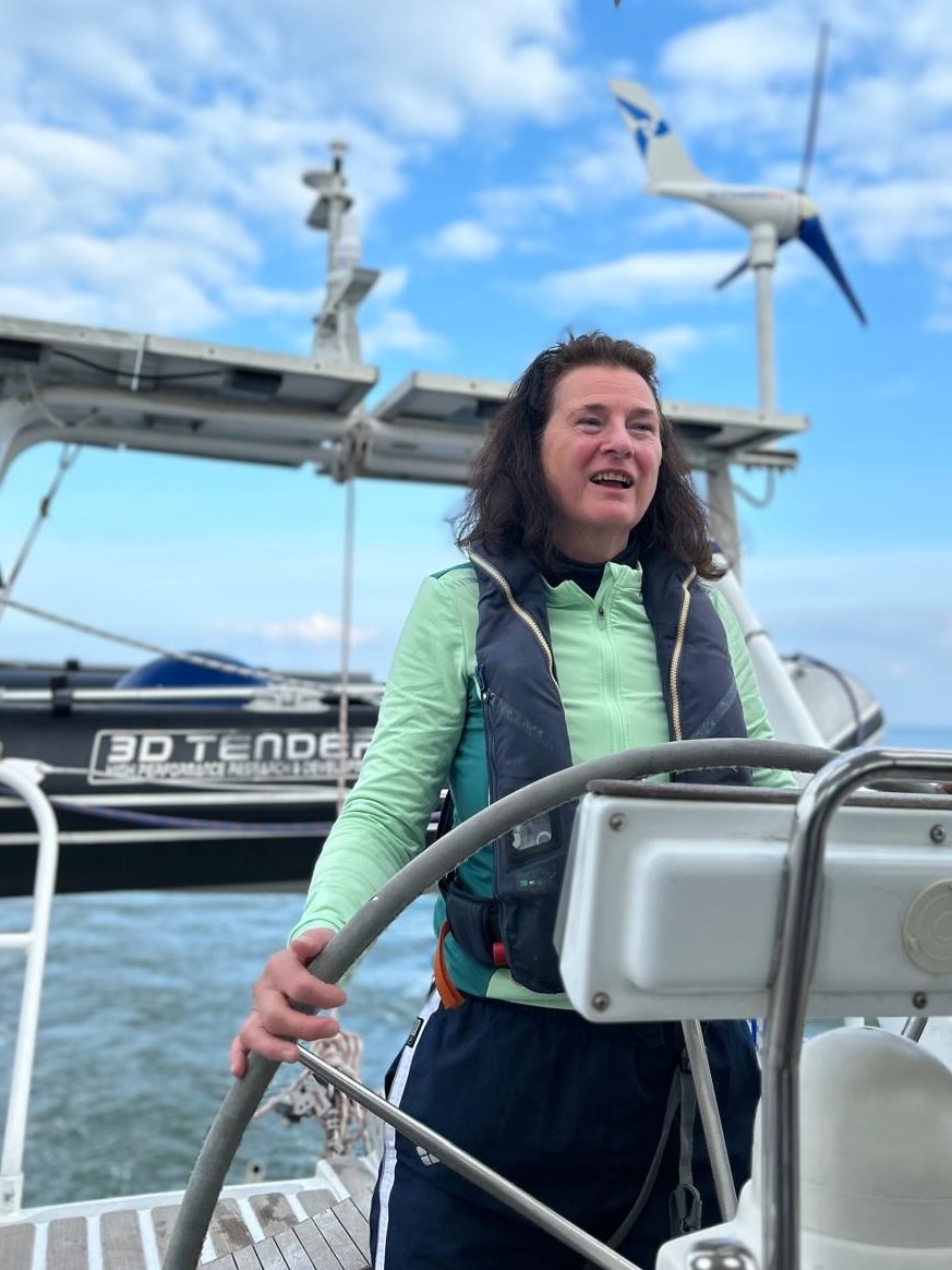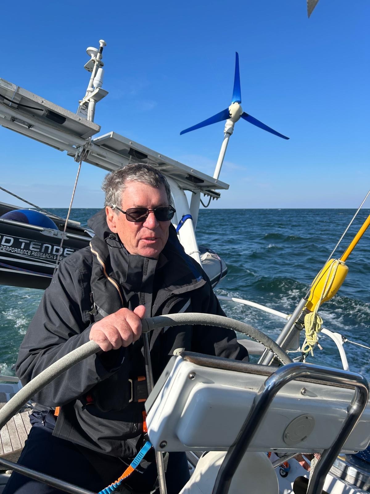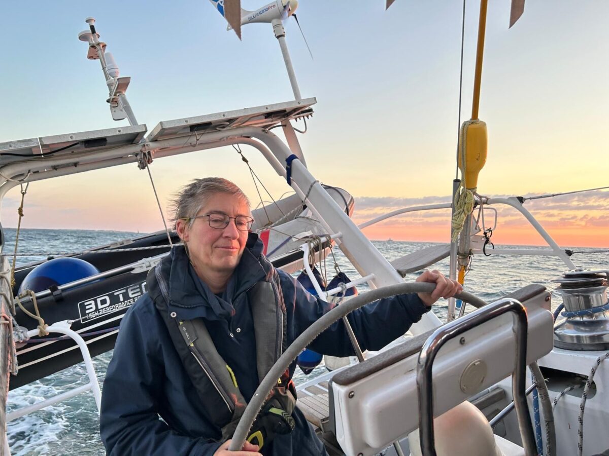 Am letzten Tag (Freitag) haben wir alle zusammen ein köstliches Frühstück an Bord. Tom bringt leckere Brötchen mit. Wie gut, dass die Captain auf die Zeit achtet und wir pünktlich um 11 Uhr ablegen. Bei bestem Segelwetter mit Südostwind und strahlendem Sonnenschein wechseln wir uns bei 8-9 Knoten mit steuern ab. (heute mal kein Autopilot!). Uta und Gerda singen für den Steuermann Holger abwechselnd Lieblingssongs aus vergangener Zeit. Man bedenke unser Alter. Die Captain flüchtet in den Salon.